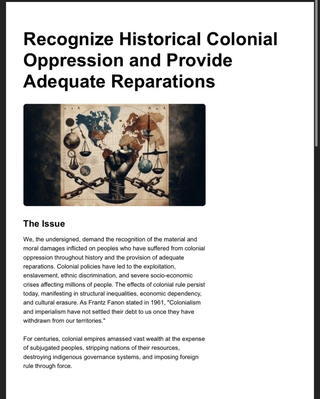 Bundan əlavə, BTQ-nin BMT-nin Nyu-Yorkdakı iqamətgahında bu il aprelin 15-də BMT-nin Afrika əsilli Şəxslərin Daimi Forumunun (AŞDF) 4-cü illik sessiyası çərçivəsində “Dekolonizasiya: Sakit İnqilab” adlı beynəlxalq konfransın sonunda başladılmış “Tarixi müstəmləkə zülmünü tanımaq və lazımi təzminatı təmin etmək” adlı petisiya da internet səhifəsində yerləşdirilib.
